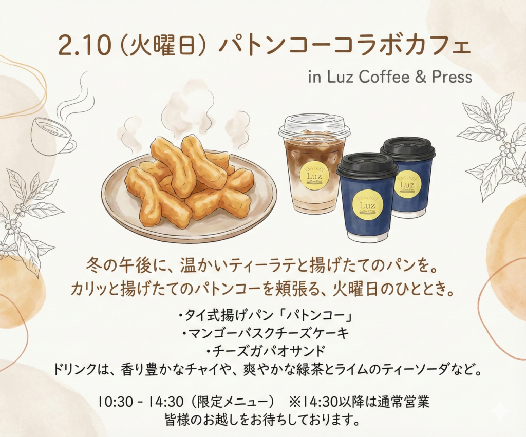2月10日(火)、Luz Coffee & Pressにて「パトンコーコラボカフェ」を開催いたします。